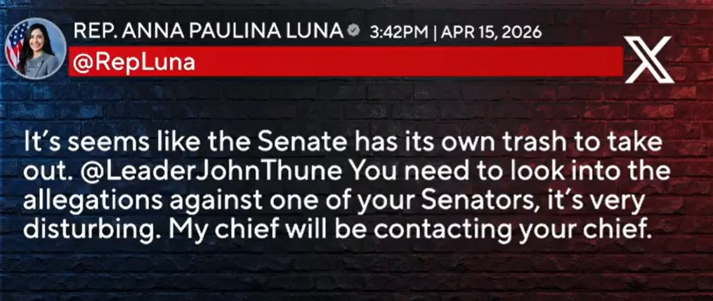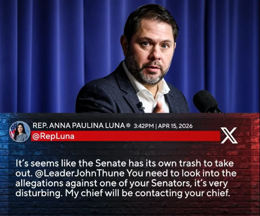 Rep. Anna Paulina Luna dropped Sen. Ruben Gallego straight into the Senate Ethics Committee. On April 15, 2026, Luna posted on X that the Senate has its own trash to take out and told Senate Majority Leader John Thune to investigate disturbing allegations against one of his senators. Her chief of staff contacted Thune’s chief of staff to deliver the details. Luna later confirmed the target is Gallego, a Democrat from Arizona, and the claims include sexual misconduct plus campaign finance violations.