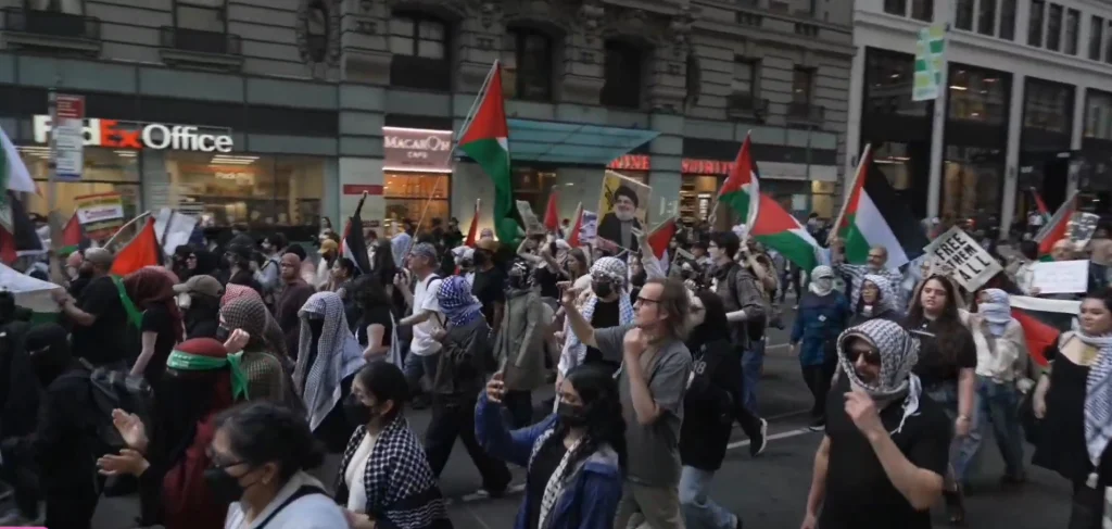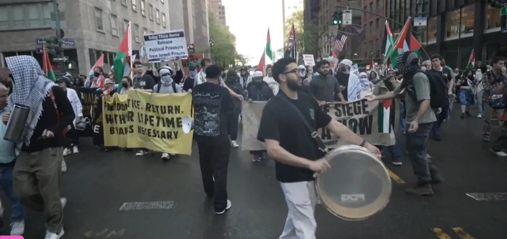 Radical protesters marched through Manhattan on April 17, 2026, screaming “Bomb Israel Now.” They passed a restaurant where some bystanders cheered and others stood in confusion. The “Free Our Prisoners” protest began at the Israel Mission to the United Nations and moved to Union Square.