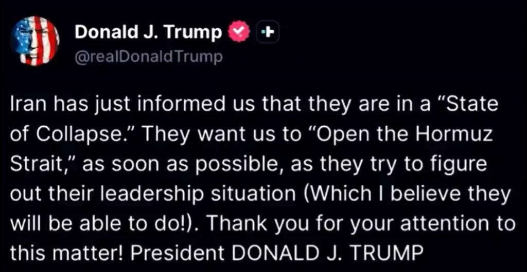 Iran has told President Donald J. Trump the regime stands in a state of collapse. Iranian officials requested the immediate opening of the Hormuz Strait. This marks a complete reversal from their position three weeks ago when they demanded 11 trillion dollars in frozen assets or no deal on any terms.