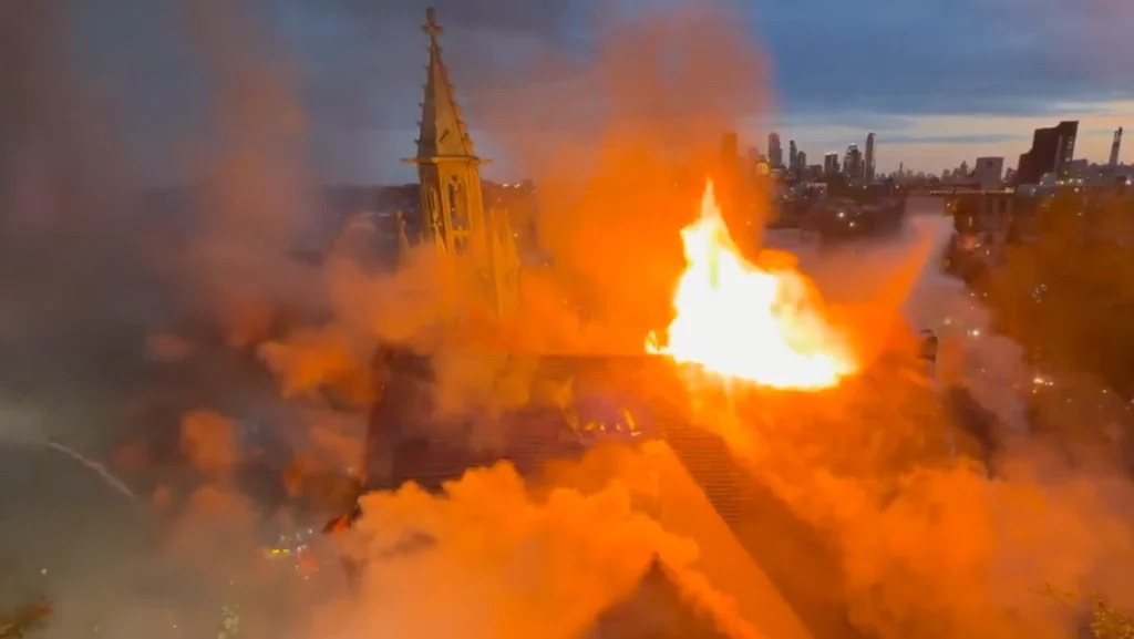 FDNY crews deployed aerial ladders and heavy hoses against intense flames shooting from the roof. Thick black smoke forced nearby residents to close windows and evacuate. The fire originated in a vacant two-story rectory before jumping to the church itself. Officials confirm the structure had stood vacant for some time, yet its historical value remained intact until this night.