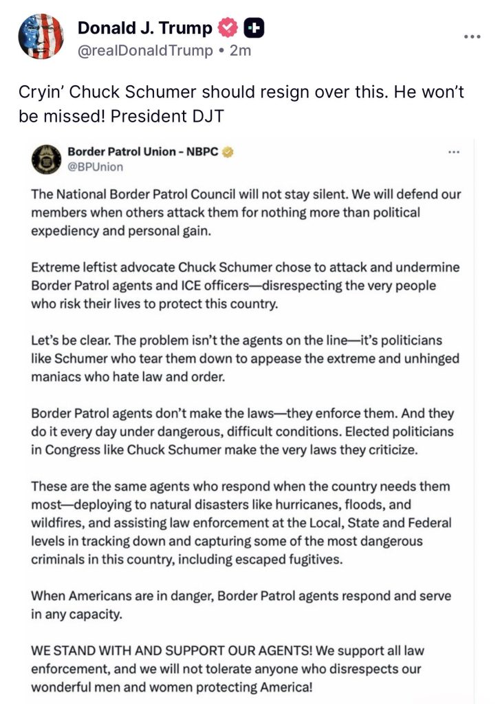 🚨 JUST IN: President Trump DOUBLES DOWN on his support for Border Patrol — PUBLICLY calls for Chuck Schumer to RESIGN
